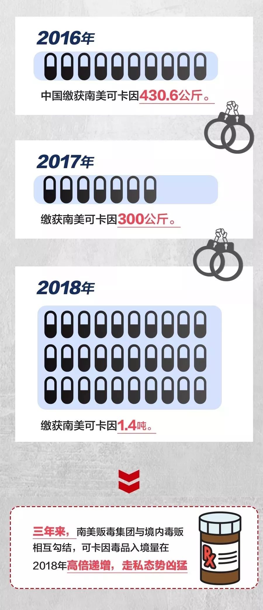 境外毒源威脅,除了“金三角”地區(qū)的毒品,還有南美可卡因。三年來,南美販毒集團(tuán)與境內(nèi)毒販相互勾結(jié),可卡因毒品入境量在2018年高倍遞增,走私態(tài)勢(shì)兇猛。